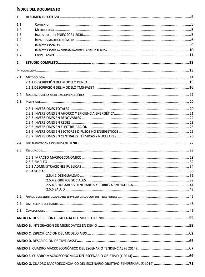 El PNIEC se divide en dos grandes bloques: el primero detalla el proceso, los objetivos, las políticas y medidas existentes para alcanzar los objetivos del Plan, así como el análisis del impacto económico, de empleo, distributivo y de beneficios sobre la salud. El segundo bloque, constituido por los Anexos al documento principal, integra la parte analítica, en la que se detallan las proyecciones, tanto del Escenario Tendencial como del Escenario Objetivo.