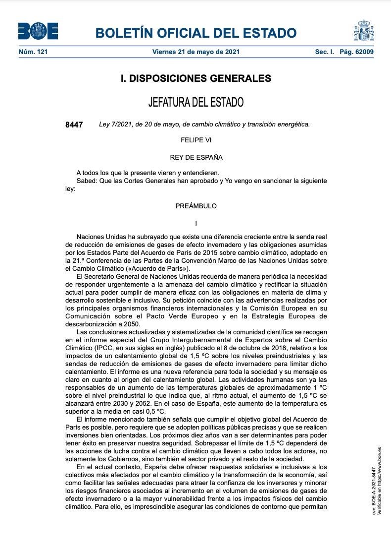 The purpose of this law is to ensure Spain's compliance with the objectives of the Paris Agreement; to facilitate the decarbonization of the Spanish economy, its transition to a circular model, so as to guarantee the rational and supportive use of resources; and to promote adaptation to the impacts of climate change and the implementation of a sustainable development model that generates decent employment and contributes to the reduction of inequalities.