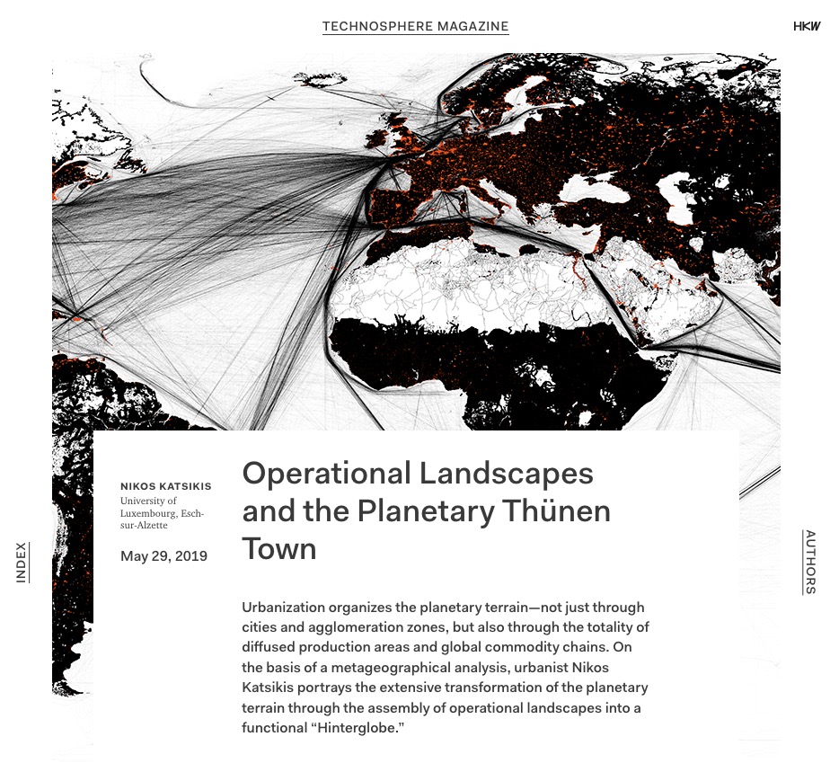 Urbanization organizes the planetary terrain—not just through cities and agglomeration zones, but also through the totality of diffused production areas and global commodity chains. On the basis of a metageographical analysis, urbanist Nikos Katsikis portrays the extensive transformation of the planetary terrain through the assembly of operational landscapes into a functional “Hinterglobe.”