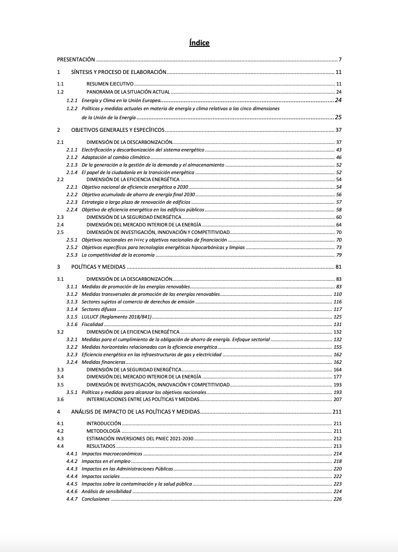The PNIEC is divided into two main blocks: the first one details the process, objectives, policies and measures to achieve the Plan's objectives, as well as the analysis of the economic, employment, distributive and health benefits impact. The second block, made up of the Annexes to the main document, includes the analytical part, which details the projections of both the Trend Scenario and the Target Scenario.