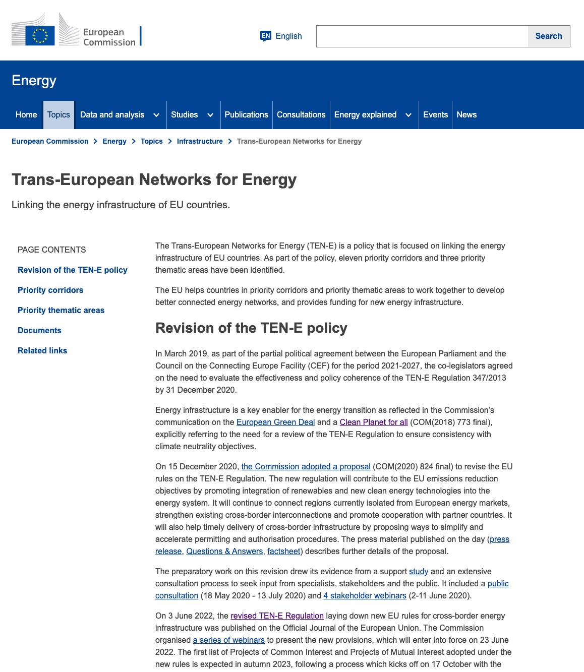 The Trans-European Networks for Energy (TEN-E) is a policy that is focused on linking the energy infrastructure of EU countries. As part of the policy, eleven priority corridors and three priority thematic areas have been identified. The EU helps countries in priority corridors and priority thematic areas to work together to develop better connected energy networks, and provides funding for new energy infrastructure.