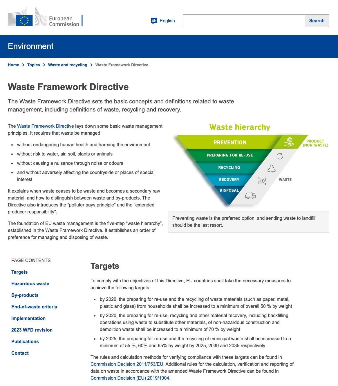 La Directiva Marco de Residuos establece algunos principios básicos de gestión de residuos. Exige que se gestionen los residuos. Explica cuándo los residuos dejan de serlo y se convierten en materias primas secundarias, y cómo distinguir entre residuos y subproductos. La Directiva también introduce el "principio de quien contamina paga" y la "responsabilidad ampliada del productor".