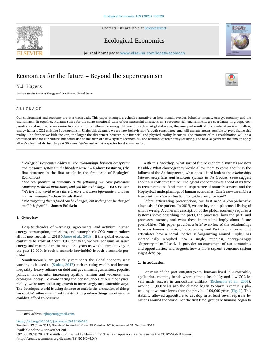 In a resource rich environment, we coordinate in groups, corporations and nations, to maximize financial surplus, tethered to energy, tethered to carbon. At global scales, the emergent result of this combination is a mindless, energy hungry, CO2 emitting Superorganism. This paper attempts a cohesive narrative on how human evolved behavior, money, energy, economy and the environment fit together.